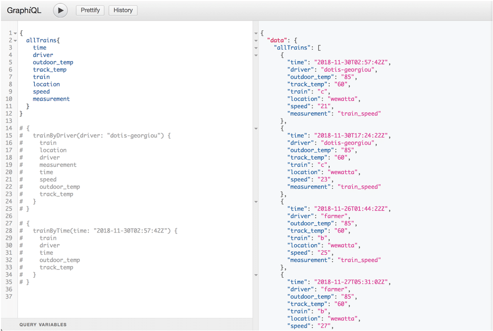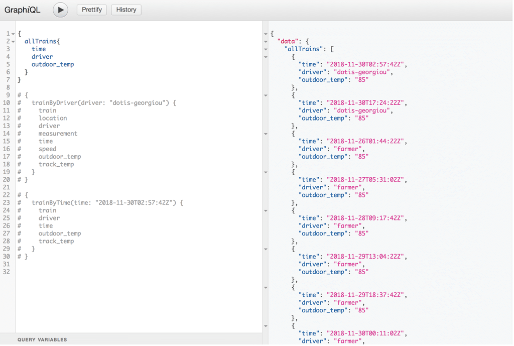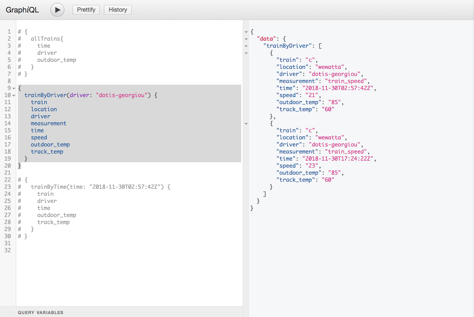 For example, I can allow my client to pass in an argument to return all trains for a single driver using the trainByDriver query. In this query, the transformation is passed down to Flux to do the work of returning the train data associated with only the requested driver while GraphQL handles the field selection. The same functionality of only returning the requested fields exists in this query as well.