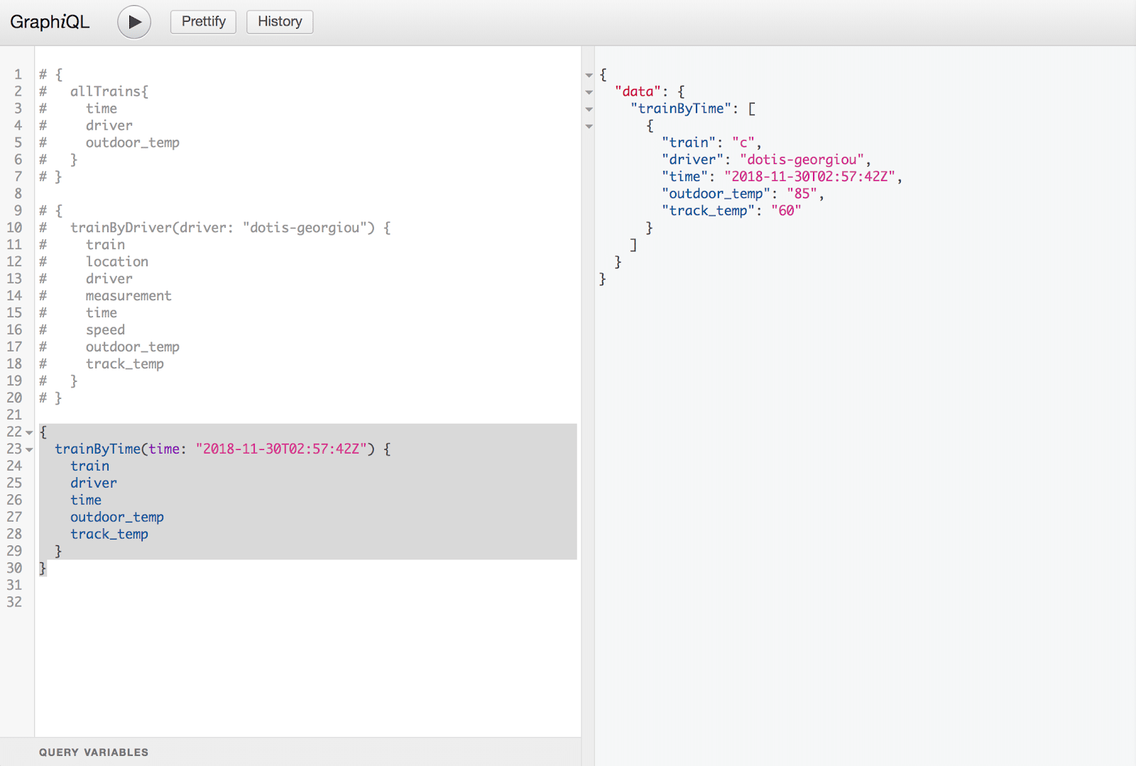 Since this is time series data we’re working with, it makes sense to allow our client to search by a single timestamp using the trainByTime query. As you can see in the Flux query generator code we discussed earlier, we again push the work of transforming the data into a Flux query to retrieve the data associated with that timestamp, and then have GraphQL return only the fields requested by the client.