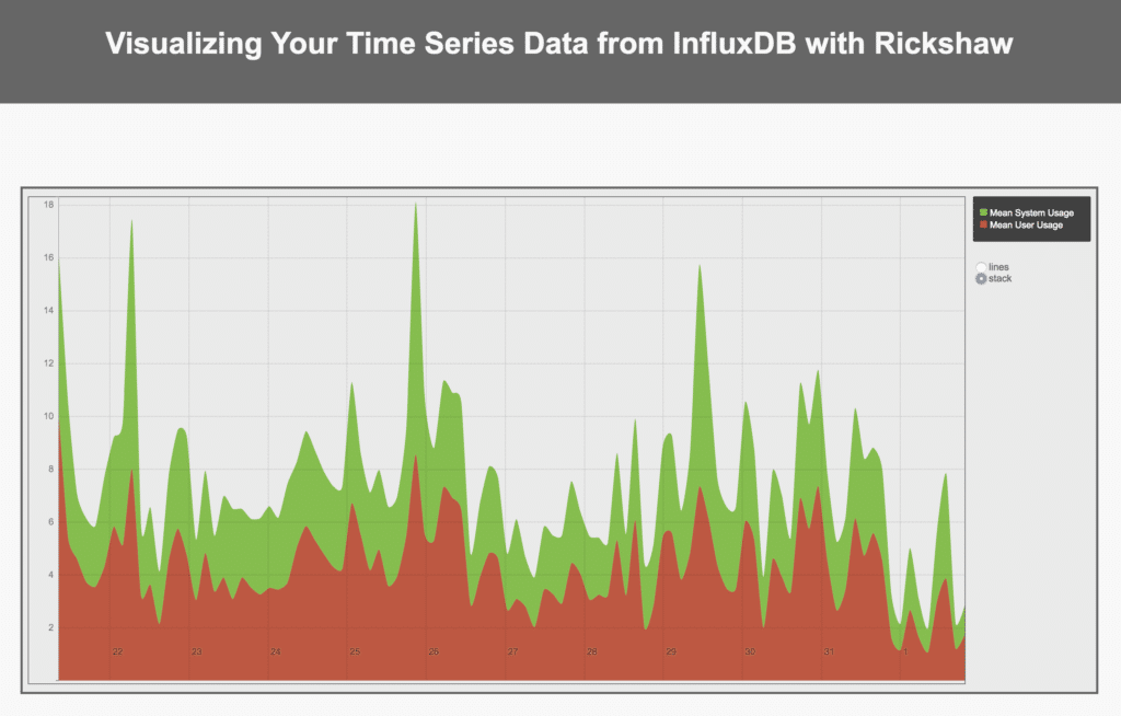 Recently, we took a look at visualizing our time series data from InfluxDB using the graphing library plotly.js (see post here), which offers over 20 different charting types, and packages everything so neatly that it is simple and easy for users to reproduce graphs of their own style and choosing. Today we’ll take a look into pulling our data from InfluxDB and displaying it with the Rickshaw library, which, like plotly.js, is similarly built on d3.js. The Rickshaw toolkit offers users the ability to create custom interactive time series graphs, giving users access to a broad array of styles and a score of different elementsrenderers, legends, hovers, and range selectorswith which to construct their graphs.