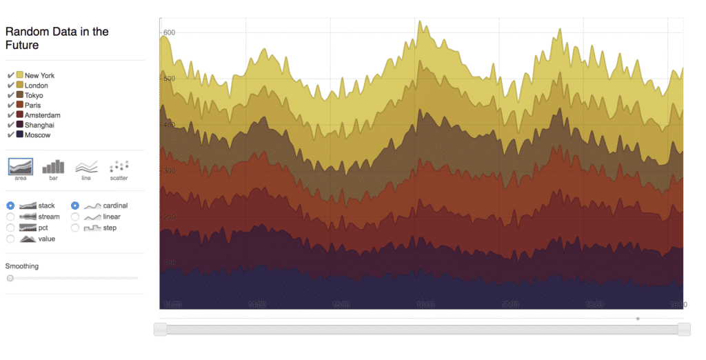 As you can see, you’ll need to define separate containers for your chart, y-axis, and legend, along with an optional toggle capability to render the graph in different formats. The separation of all these components allows users to create custom formatting and unique visualizations, but it can also be a bit tricky to set everything up as newbie to the graphing game. I, for instance, tried to reproduce a version of the following example straight away, and realized all too quickly, it would probably be better to start at the beginning first with Rickshaw’s tutorials.