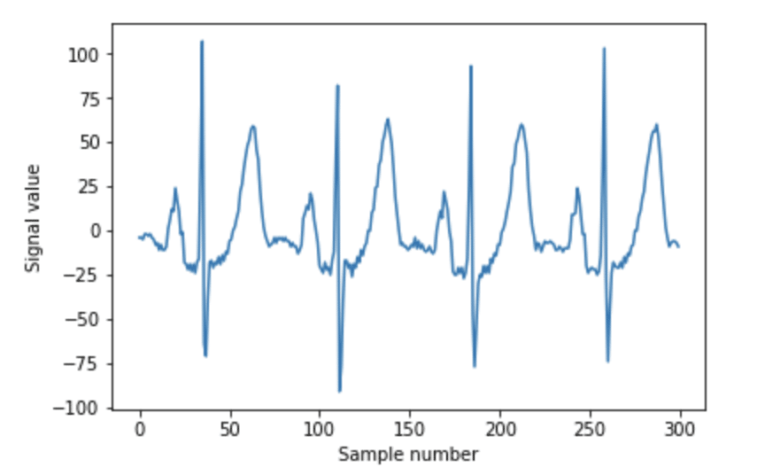 To perform segmentation, you must first decide how long you want your segments to be. If you look at the data, you can see three repeated shapes. Around “Sample number” 30, 110, 180, and 260 we see a steep peak, known as the QRX complex. Before each QRX complex, there’s a small hump. This is referred to as the P-wave. Immediately following the QRX complex, we have the T wave. It’s the second tallest peak with the largest period. We want to make sure that our segment length is long enough to encapsulate each one of those waves. Since the T wave has the longest period, we will set that period equal to the segment length where seqment_len= 32.