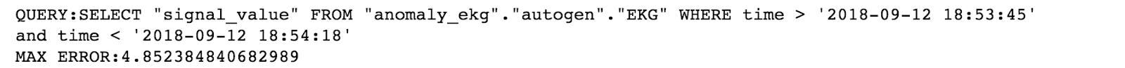 Now I am ready to start the anomaly detection. First, I query my anomaly data with the Python client. Although the data is historical, this script is meant to emulate live anomaly detection. I query the data in 32-second intervals as if I were gathering it from a data stream. Next, I create the reconstruction as before and calculate the max reconstruction error for each segment. Finally, I write these errors to a new database called “error_ekg”.